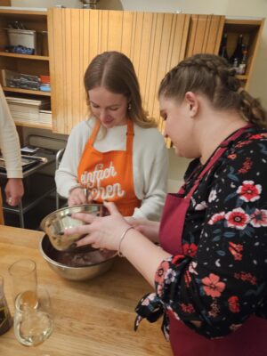 Tras un aperitivo, pasamos directamente al mise en place y a los fogones. El menú fue tan variado como el equipo: desde pasta puttanesca vegana y patatas con espinacas y tahini veganas, hasta “schnitzel” de setas, pierna de cordero asada con salsa de chile sichuanés —para nuestros carnívoros— y brownies con butterscotch para terminar con un toque dulce.